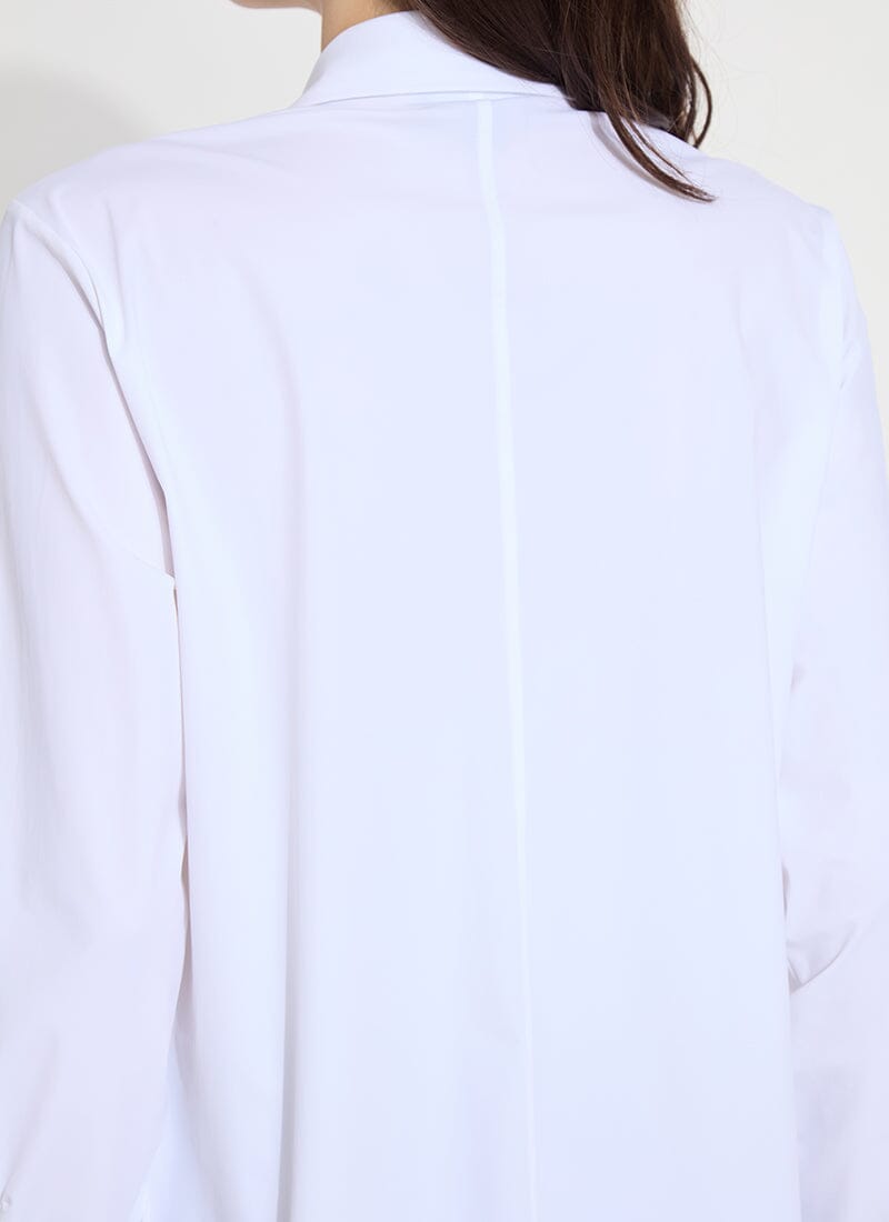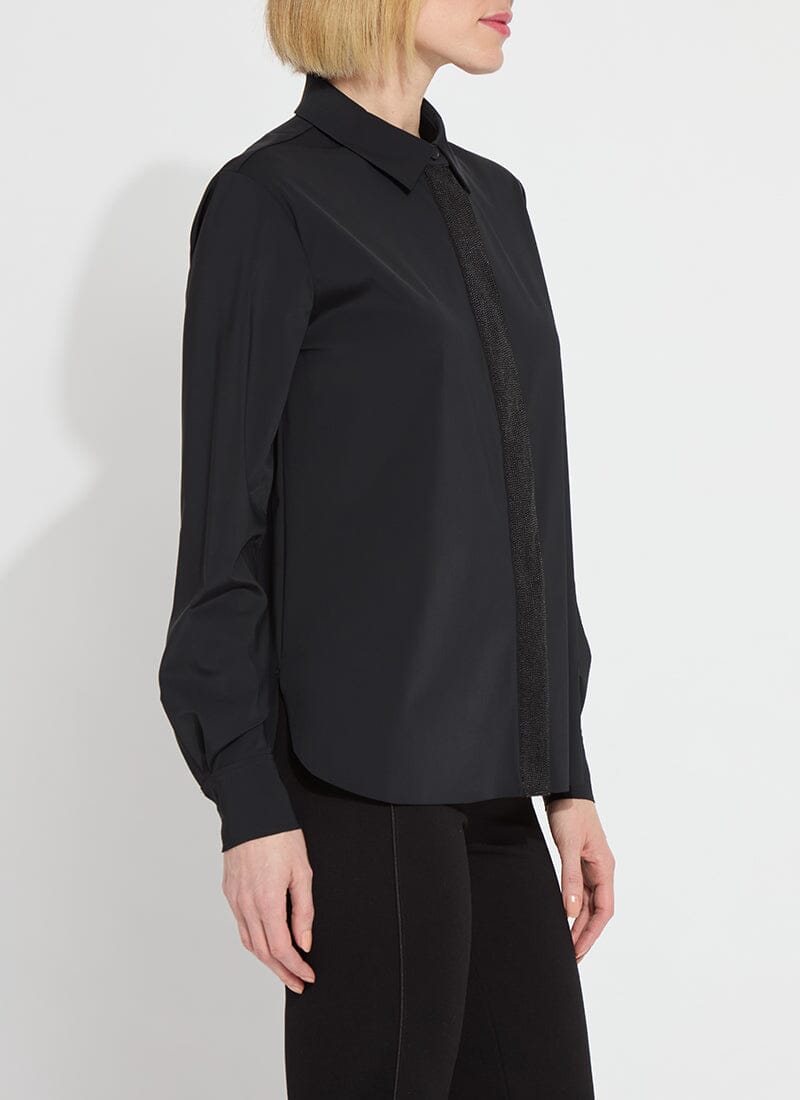 The Connie Micro Beaded Shirt offers a curved, hip-length, high-low hem and sophisticated micro beading on the front placket. Fashioned from travel-friendly, wrinkle-resistant Microfiber, the Connie Micro Beaded Shirt perfectly accompanies wide-legged jeans, boots and the Kathy Cardigan Jacket.