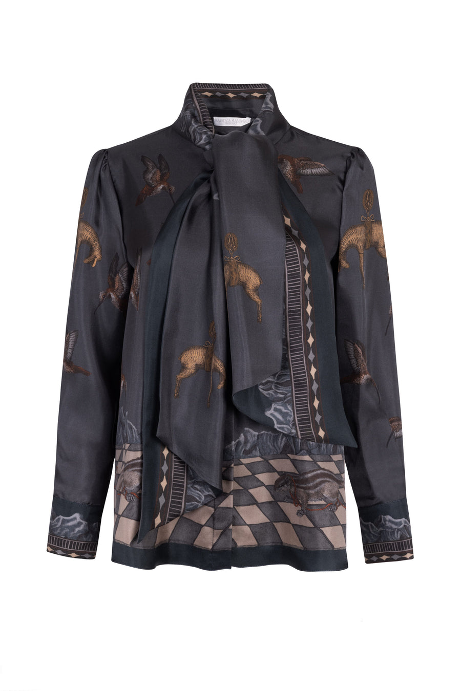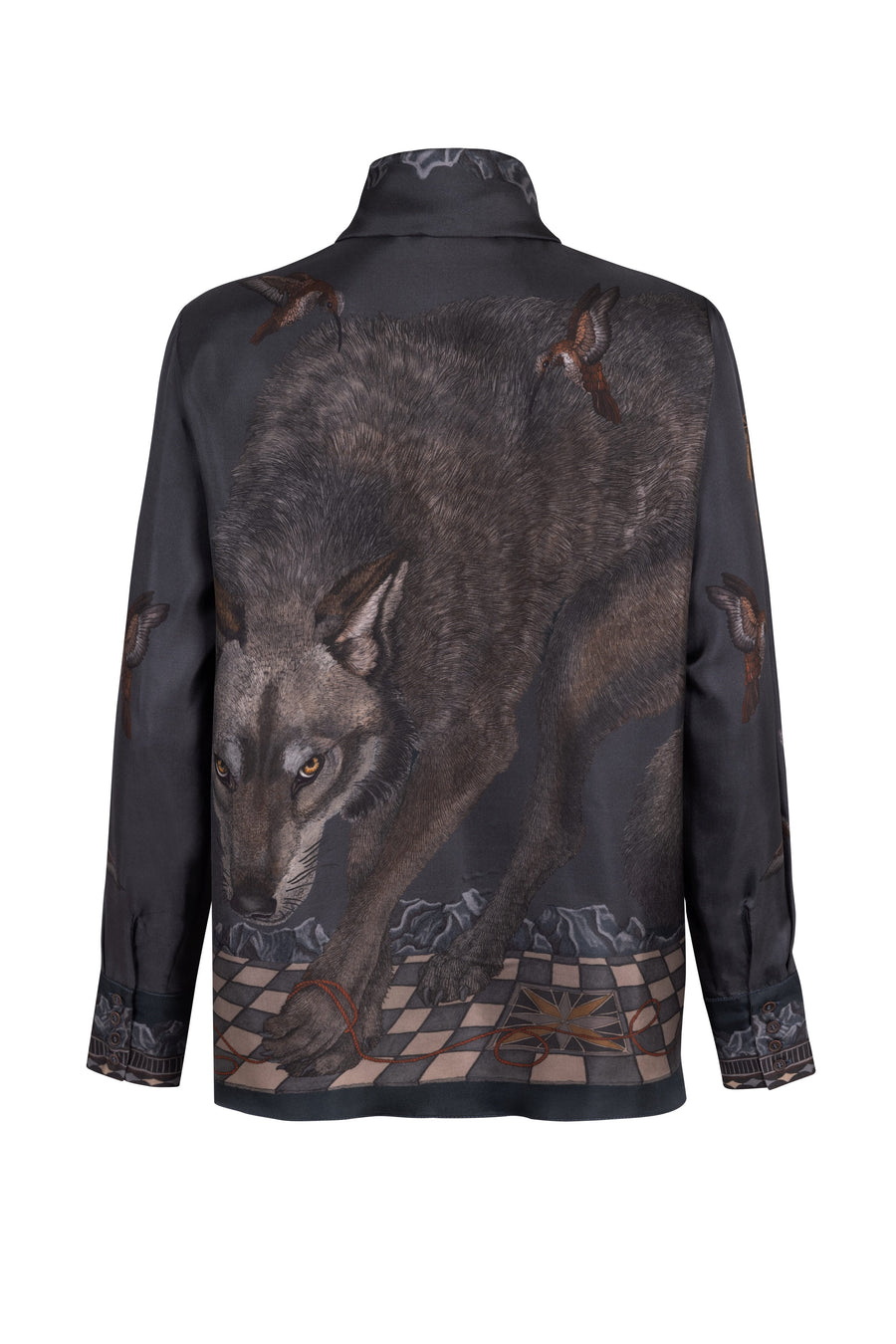 The Wolf You Feed Tie-Neck Silk Blouse draws inspiration from a wide range of sources. The wolf motif was first inspired by the incredible dioramas at the American Museum of Natural History in New York and recognises the extirpation and near-extinction of the gray wolf from the United States due to a program fuelled by human prejudice and fear. The titular phrase references an ancient Cherokee legend; every man has two wolves fighting inside of him. One is angry, greedy and resentful, while the other is kind, peaceful and loving. Which wolf will win? The wolf you feed. Many of the details within this design were inspired by the art of fraternal societies, re-purposed to represent a reverence for nature, including the golden fleece. Nineteenth century, hand painted parcheesi boards provided references for many of the pattern details, while the plight of the naïve chipmunk alludes to a second, pertinent legend.