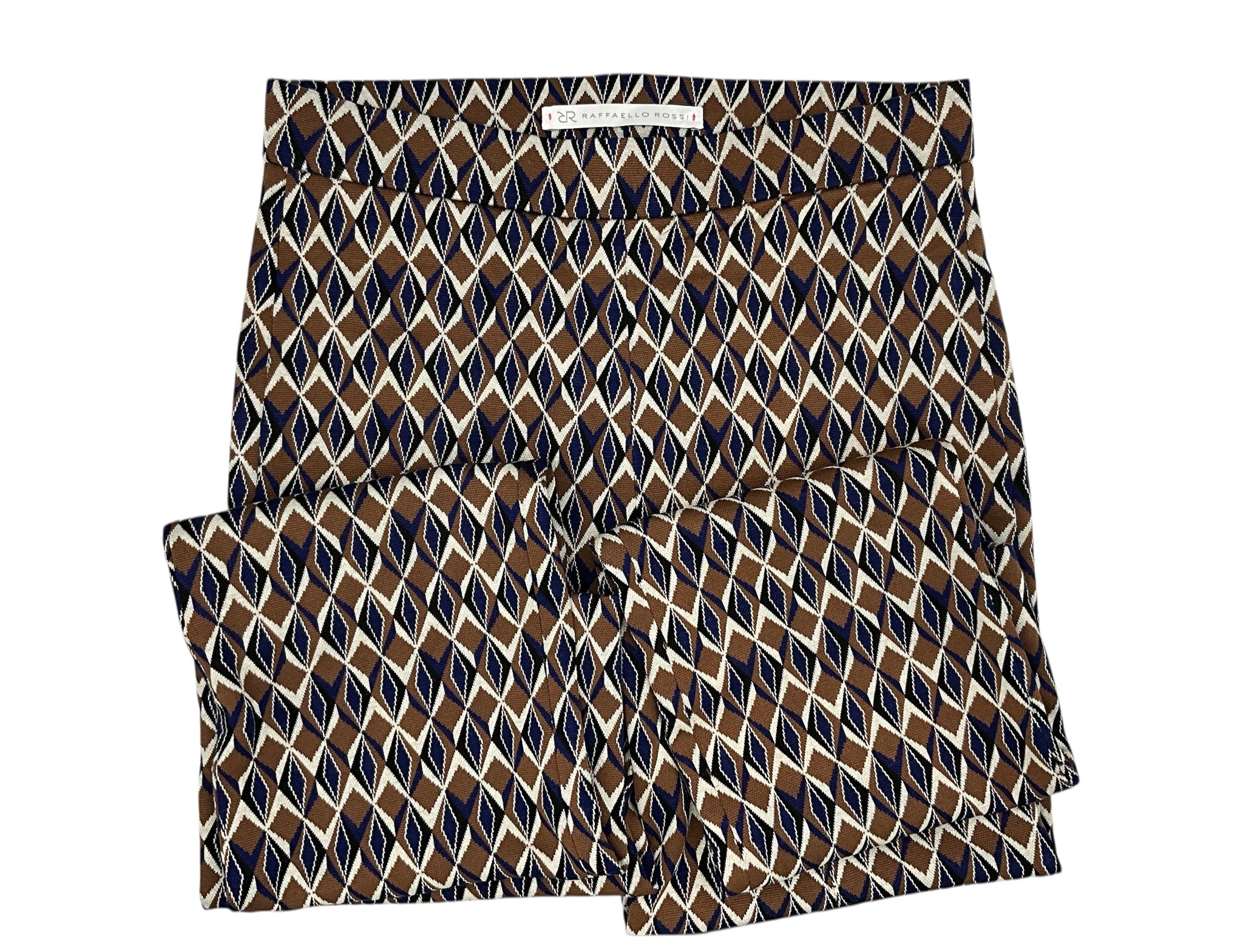 The Raffaello Rossi Macy Diamond pull on trouser in a 7/8 length is oh so fun and comfortable.  These trousers have a slim leg with a flared silhouette.