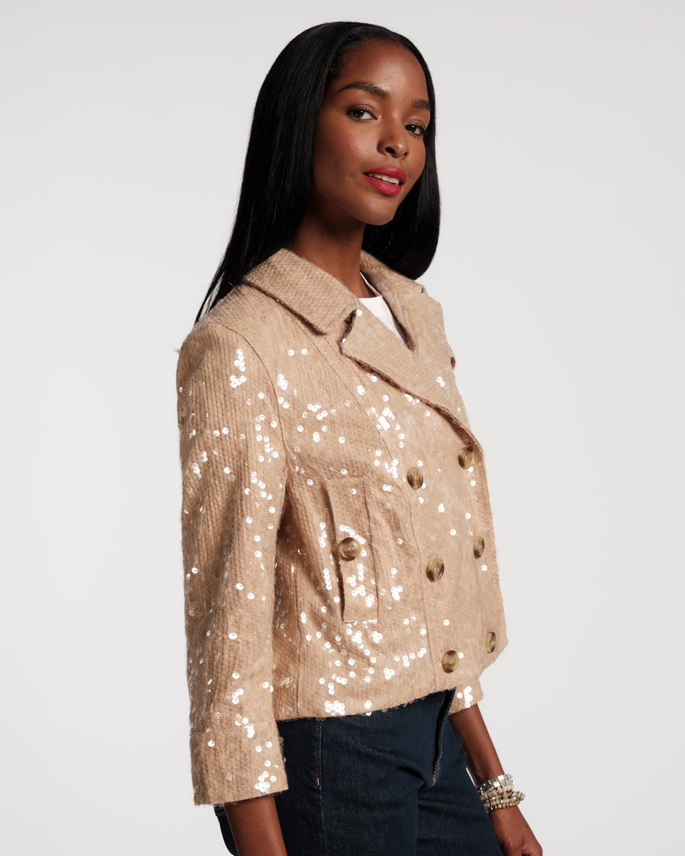 Double-breasted sequin jacket with long sleeves -- Features 2 side pockets -- Shell: 100% cotton, fully lined (96% polyester, 4% spandex) -- Made in India