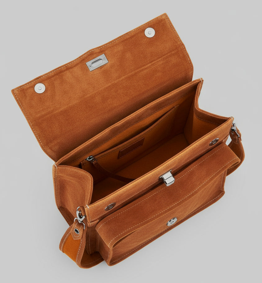 Base width: 13" --- Top width: 11.75" --- Height: 9.1" --- Depth: 5.1" --- Removable strap length: 46" --- 2.4 lbs