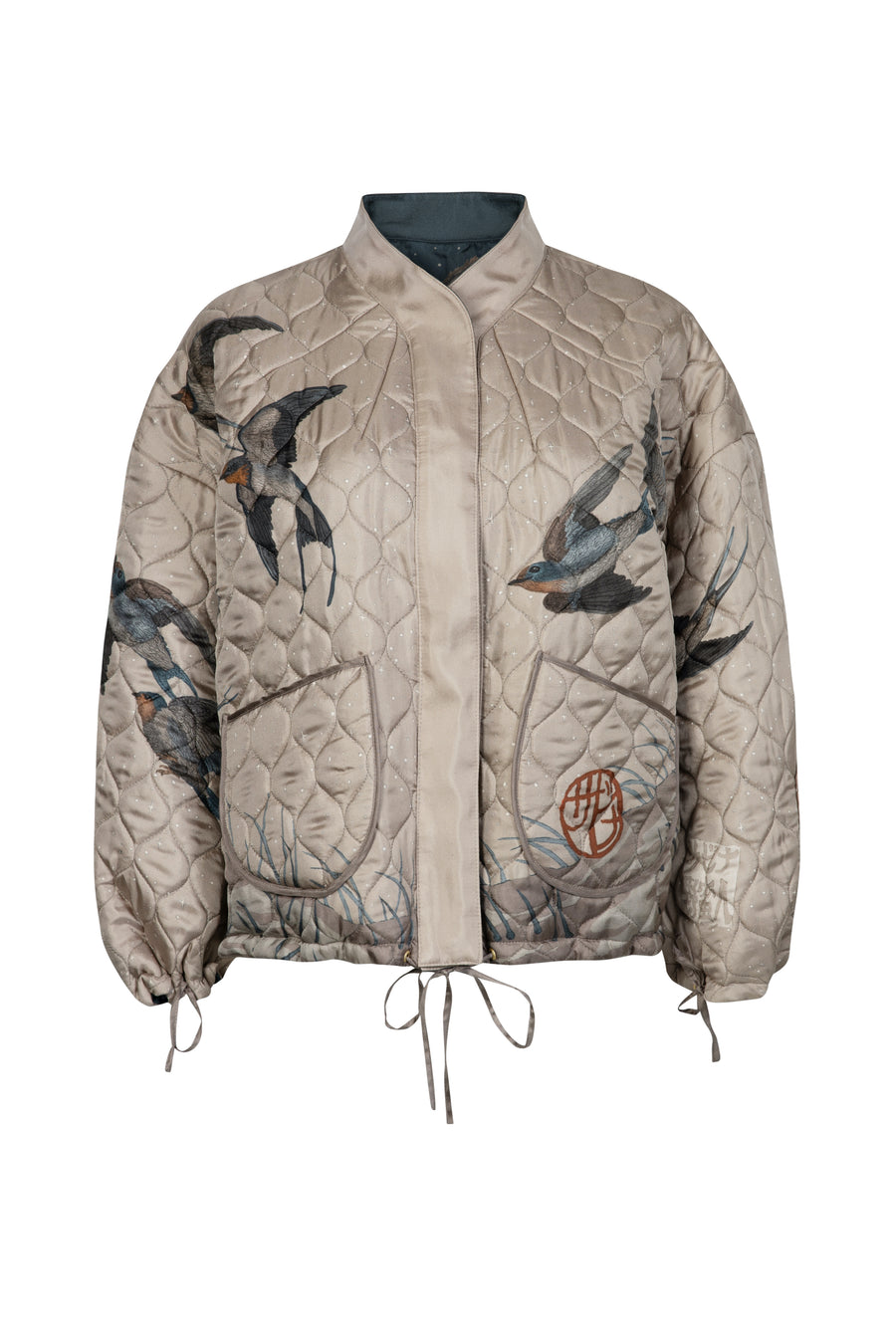 The Reversible Quilted Bomber Jacket is designed, printed and made in England. This double-sided garment is constructed from quilted silk twill on one side, and unquilted silk twill on the other, with each side displaying a contrasting colourway. The jacket hemline falls at hip-height, and the ribbon drawstrings can be adjusted using the metal cord-stoppers to offer a variety of styles. With the drawstrings tight, the jacket is cropped and compact, but once the ties are loosened, the jacket offers a more trapeze-like fit. The bomber jacket fastens using magnetic, subtly branded snaps concealed beneath the centre front placket. Patch pockets have been applied to the quilted side of the jacket; the placement print meaning that the design continues entirely uninterrupted.