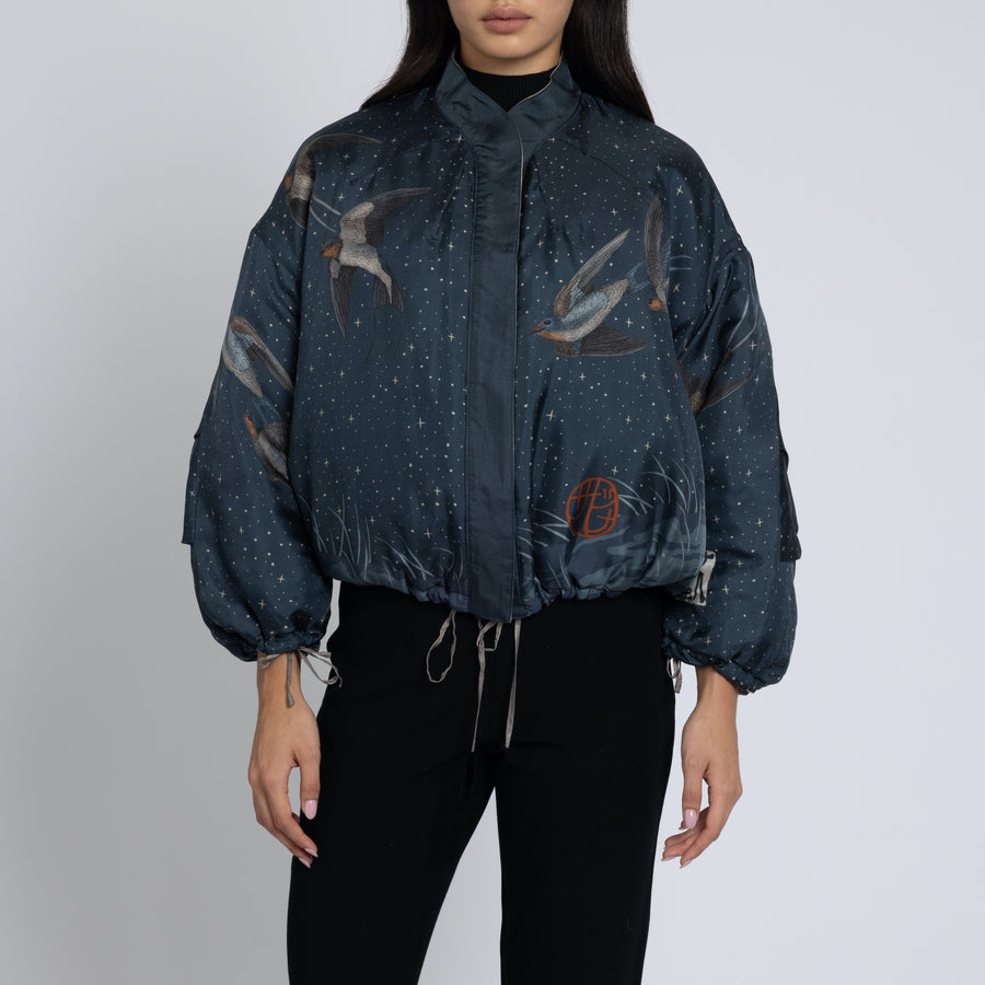 This design references many elements of the arts and culture of Edo-period Japan. It features a magnificent clouded leopard’s face filling the centre back of the design; his whiskers are wild and unruly, his facial expression alert and attentive. A hand-scripted measurement in Japanese references Edo-period zoological manuscripts. In the background glimmers a starry midnight sky and a crescent moon glows in the distance. The front of the bomber jacket features the starry sky and textured, grassy hillside, with sweeping swallows gliding gracefully across the body and sleeves in one flattering and elegant motion. A hanko stamp bearing the name Sabina Savage brands the front hemline and one cuff of the jacket.