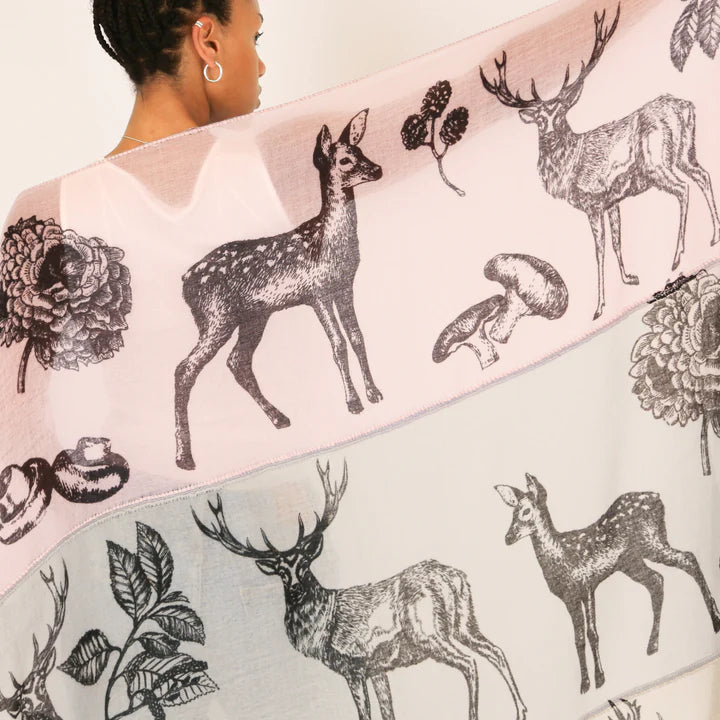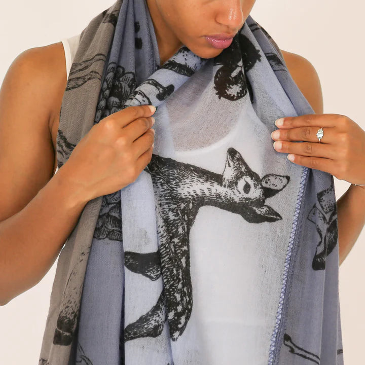 Our hand-felted fine cashmere scarf Woodland 3 Color Felted Scarf is a hand-printed forest. The unique design features delicate woodland animals—chickens, deer, and hedgehogs—set within classic patterns in three harmonious colors, creating a timeless look. A luxurious touch for any outfit.