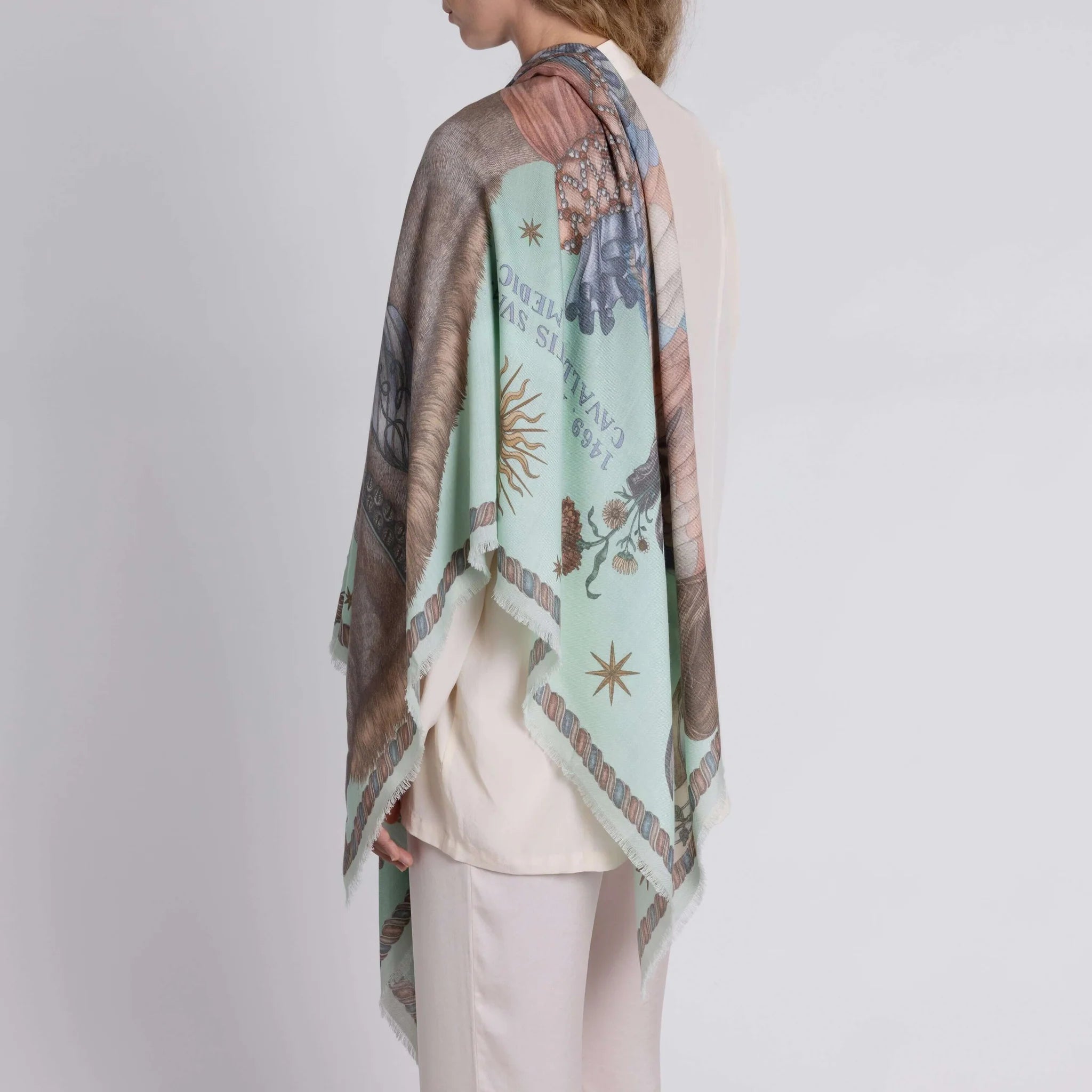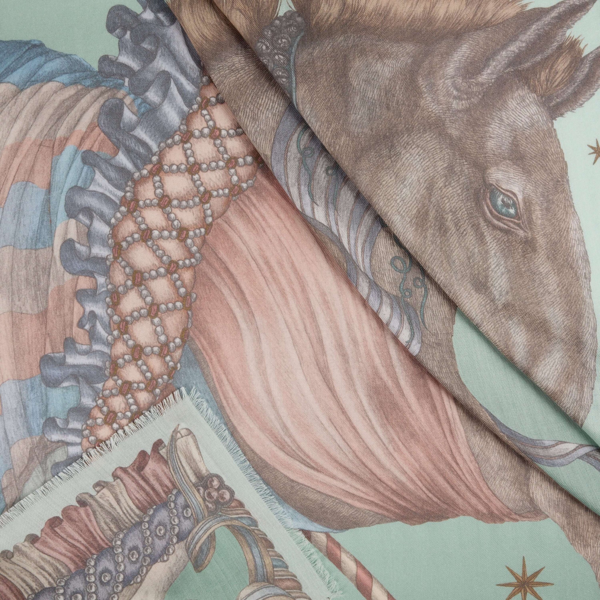 The Celestial Steed was inspired by Italian Renaissance paintings and cultural events alongside beliefs and attitudes of the era; the dichotomy of idealism versus naturalism opening a portal to landscapes of fantasy, a ‘New World’. Inspired by Orso, the unrecognised equestrian star of the famous jousting tournament held by Lorenzo di Medici in 1469, the stark, strong motif of this design was largely influenced by the disarming boldness and architectural simplicity of Antonio Pisanello’s studies of horse heads in his famed Codex Vallardi, alongside equestrian works by Dürer, and various frescoes and masterpieces of the Renaissance era. The armorial elements, such as the sabaton shoe atop the steed’s back, the gauntlet below, and the candy-striped jousting pole all reference historical examples from the Renaissance, while the horse’s striped and embellished carnival attire was inspired by a German illustrated tournament book of the era. The inclusion of sheer fabric is an allusion to Renaissance artwork and symbolism, a juxtaposition of strength and delicacy. Similarly, the metallic armorial elements are holding dainty, fragile flowers; carnations symbolising devotion and divine love, daisies mirroring solar movements throughout day and night; the setting of the sun is inevitably followed by its rising, and there can be no more powerful symbol of hope and resurrection.