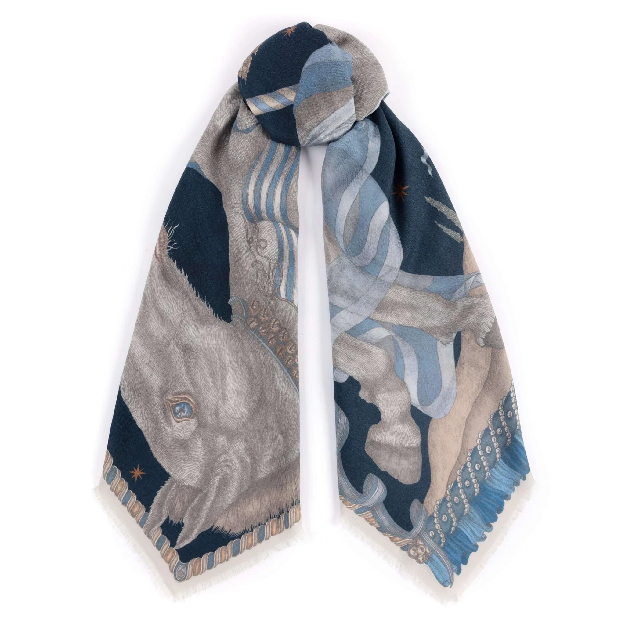 Caught fast in the chasm between night and day, The Celestial Steed is paused in step. Below the heraldic sun, lit by the moon of Galileo Galilei and gilded by the stars of Giotto, we see the pure architectural majesty of this magnificent mount. The silvered metallics of the armoured sabaton and glove are softened by carnations, a simple symbol of divine and earthy love under a cosmic sky. Known as ‘solsequeter’, daisies below open and close with the sun; a powerful sign of resurrection.