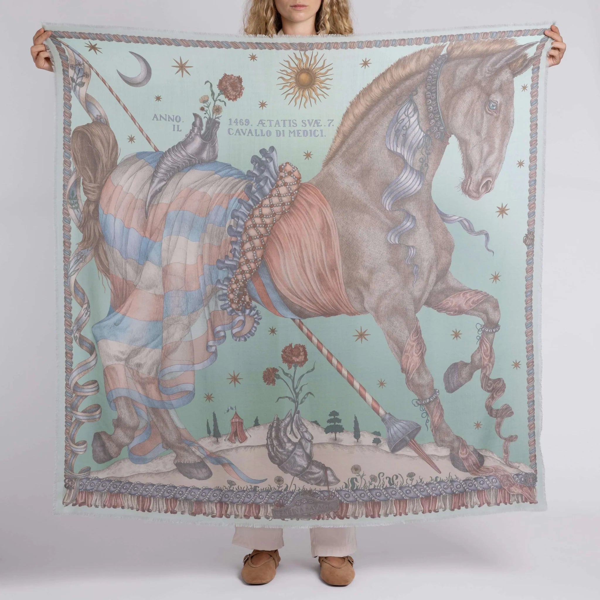The whimsical text within the design references Giuliano di Medici’s famous mount.